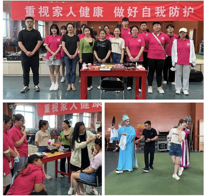 6月29日,实践团队来到盐城市淮剧团,走访了就职于此的开放教育校友陈菁雅、唐晓云和刘建君。交流中,校友们真诚表达了对母校和老师们悉心栽培的感恩之情,分享了学习、工作的点滴。在向实践团队介绍了淮剧的文化背景、表现形式后,校友们为同学们开展了生动的淮剧妆容实训课程。同学们兴致勃勃参与了刷桃红面、画“元宝嘴”、描眉、勒头戴头面等戏曲妆容的各项步骤。近4个小时的实训课程让同学们在潜移默化中接受了传统文化的熏陶,也体会到了戏曲演员“台上一分钟,台下十年功”的辛勤与付出。同学们不仅深刻体验到了戏曲之美,增进了对中国传统文化的认同,也点燃同学们传承和弘扬传统文化的热情。