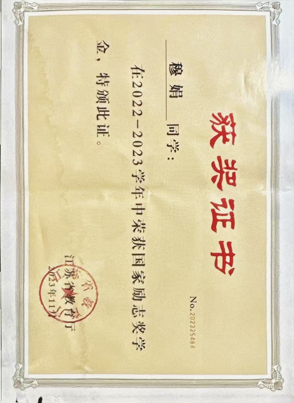进入本科阶段后,穆娟始终没有放松对自己的要求。由于是跨专业考入本科院校,相比其他同学,她的专业基础相对薄弱,平时需要花费更多的时间与精力在专业学习上,更多的学习挑战也接踵而至,但这些没有消磨掉她的斗志,反而让她更加坚定信念,奋勇向前。穆娟继续利用各种机会拓展自己的专业技能,积极参加学校各项活动,在班级中担任学习委员,作为老师的助手、同学的帮手,协调处理同学们的学习难题。在本科阶段,经过一年的刻苦学习,以绩点4.3的成绩顺利获得2022-2023学年国家励志奖学金和学院二等奖学金。穆娟还抓住实习、实践的机会,把所学专业知识应用于实际工作,从而提升实践能力与运用能力,日渐娴熟的专业技能让她变得更加自信。