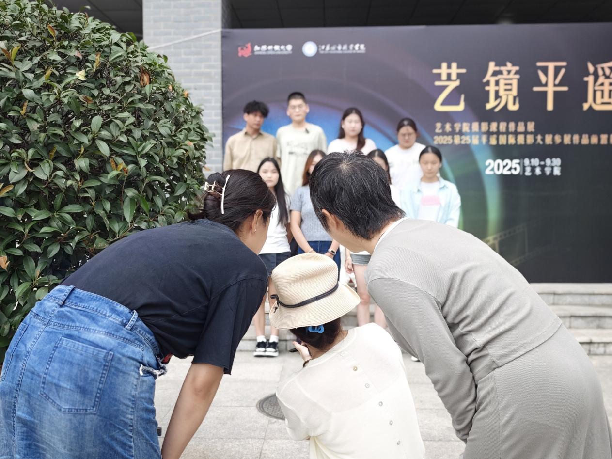下午,系部影视摄影与制作专业教研团队将会议内容转化为实践行动,前往应天校区,共同投入2025平遥国际摄影展院校宣传视频的摄制工作。师生团队在前期的充分准备基础上,利用校园建筑与自然景观,在我院“艺境平遥——2025届平遥国际摄影大展参展作品前置展”的展位前以饱满的热情完成了拍摄。