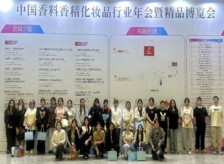 为深化“产教融合、知行合一”育人理念,助力师生对接行业前沿、推动课程成果向产业价值转化,9月26日,艺术学院形象艺术系高彤彤老师、陈雪茹老师带领23级化妆品经营与管理专业学生参加了2025中国香料香精化妆品行业年会暨精品博览会(CAME)。