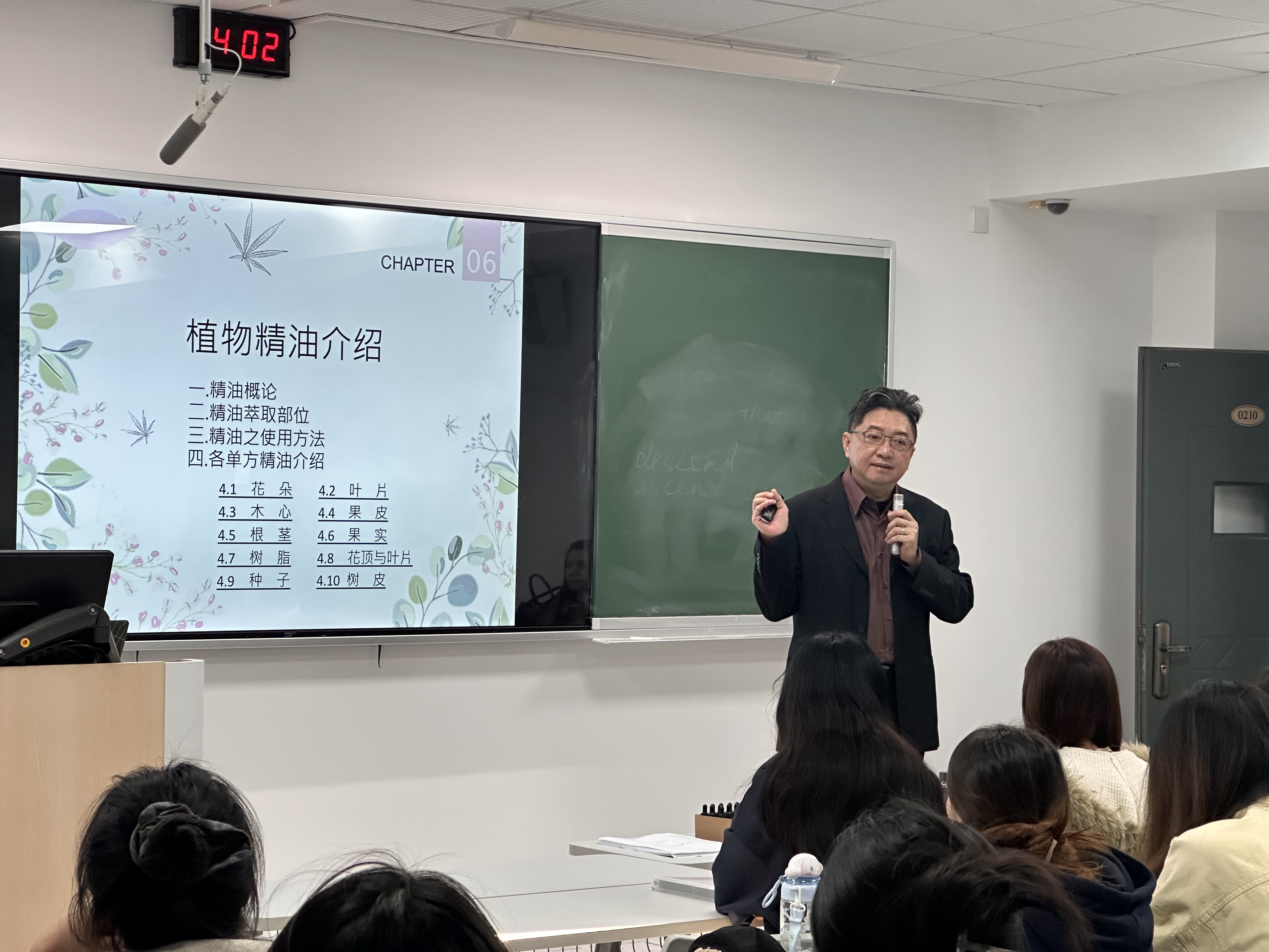 课堂上,来自台湾的吴奕贤会长以《芳香精油在皮肤养护中的实战应用》为题,结合自身深耕芳香疗法领域数十年的经验,从精油的分类属性、功效机理切入,重点聚焦敏感肌修复、皮肤抗衰等常见美容需求,系统讲解了精油在皮肤护理中的科学搭配与安全使用方法。为让学生直观感受技术要点,吴会长现场示范了嗅吸疗法、局部护理等实操技巧,并设置互动环节,指导学生分组完成专属精油护理方案的设计,在香气交融的实践中夯实专业技能。