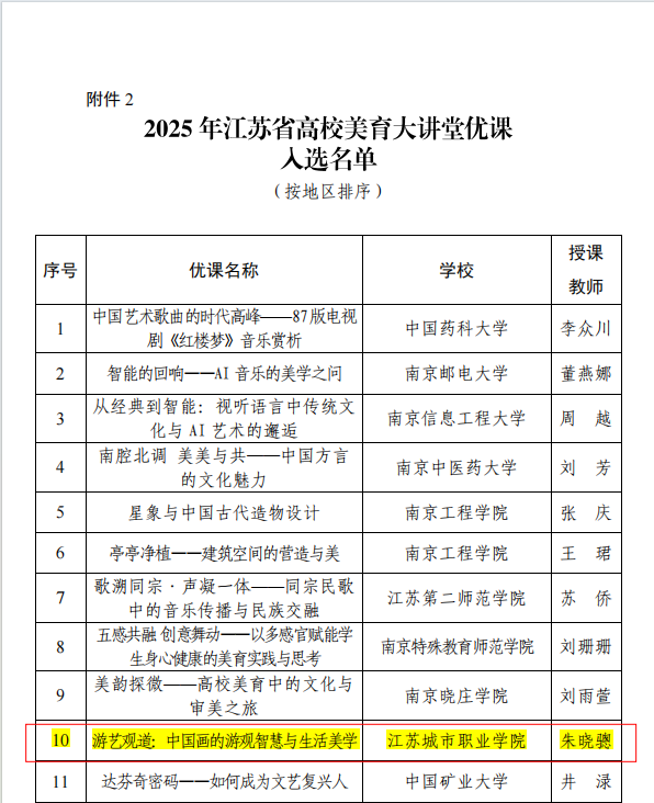 近日,江苏省教育厅发布《2025年江苏省高校美育精品课程(专业艺术类)培育名单及美育大讲堂优课入选名单公示》,艺术学院文化休闲系教师朱晓骢报送优课《游艺观道:中国画的游观智慧与生活美学》成功入选。全省共85所高校推荐134门美育精品课程(专业艺术类)和132个美育大讲堂优课参评,其中40个美育大讲堂优课入围复评。经组织专家遴选,评出30门课程列入2025年省高校美育精品课程培育名单,30门优课入选2025年省高校美育大讲堂。