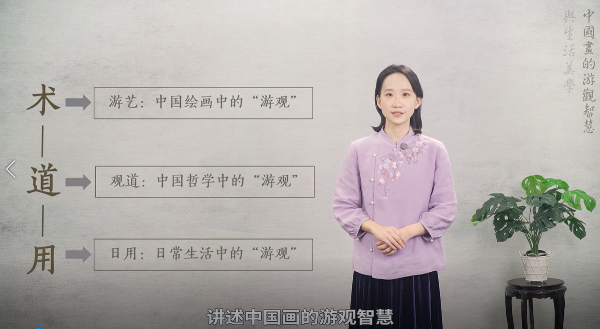朱晓骢老师申报的课程以中国画“游观”理论为切入点,遵循“术—道—用”的课程设计脉络,设计“游艺:中国绘画中的‘游观’”“观道:中国哲学中的‘游观’”“日用:日常生活中的‘游观’”三大课程模块,带领学生鉴赏经典画作,理解中国画“动态游观”的绘画视角,提炼“澄怀观道”“天人合一”的人生哲学,并将美术鉴赏与哲学思考融入日常生活,提升学生对传统文化的自豪感,建立深度、沉浸、富有意义感的生活模式,实现美育浸润。